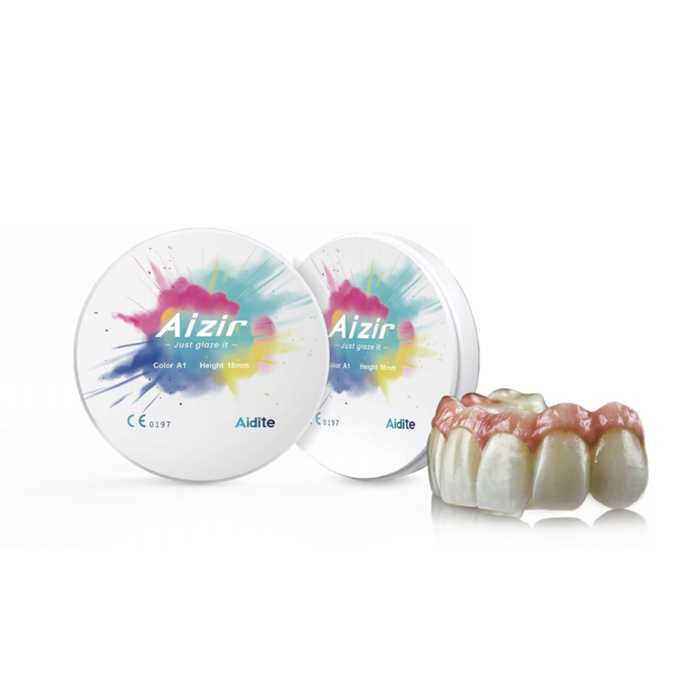 Aidite has 17 years of experience in the development and production of Zirconia with stable material performance. Aizir represents it's most advanced R&D, integrating several patented technologies in one disc meeting the full range of indications. It has larger systematic processing, a wider sintering temperature range (1510-1570°c) and an increased stable three-dimensional gradient effect.